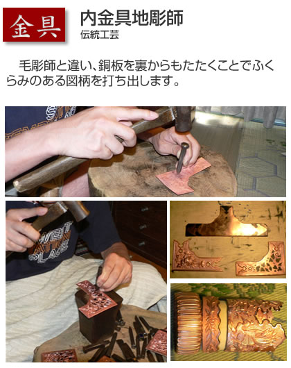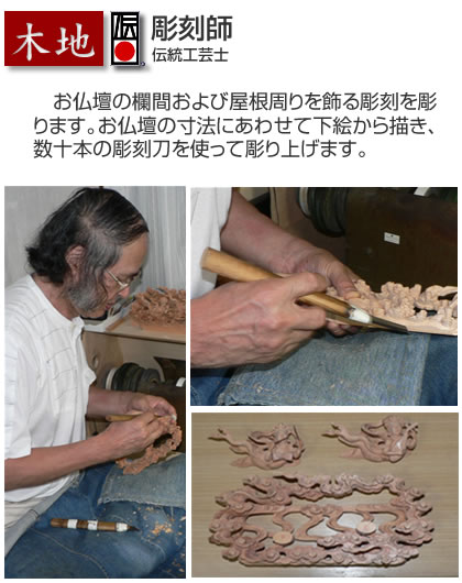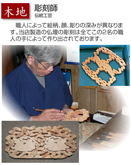 仏壇の製造は多くの匠たちによって支えられています。伝統工芸士たちの確かな技が加藤仏壇の品質と信用を支えます。職人さんの多くは親子代々にわたり加藤仏壇の製造に携わっています。